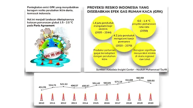 | Tren emisi Efek Gas Rumah Kaca (GRK) dalam juta ton di Indonesia. | Sumber data: Katadata Insight Center (Naskah Muhammad Taufik). |